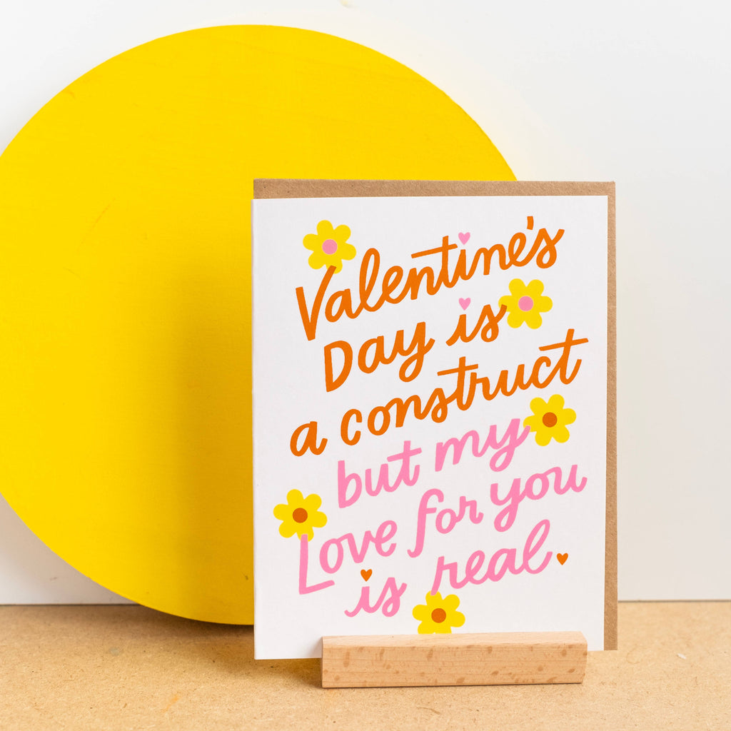 "Valentine's Day is a construct but my love for you is real" - a witty and funny Valentine's card for the v-day skeptics who still want to spread the love! Features hand lettering and hand-drawn minimalist flowers.
