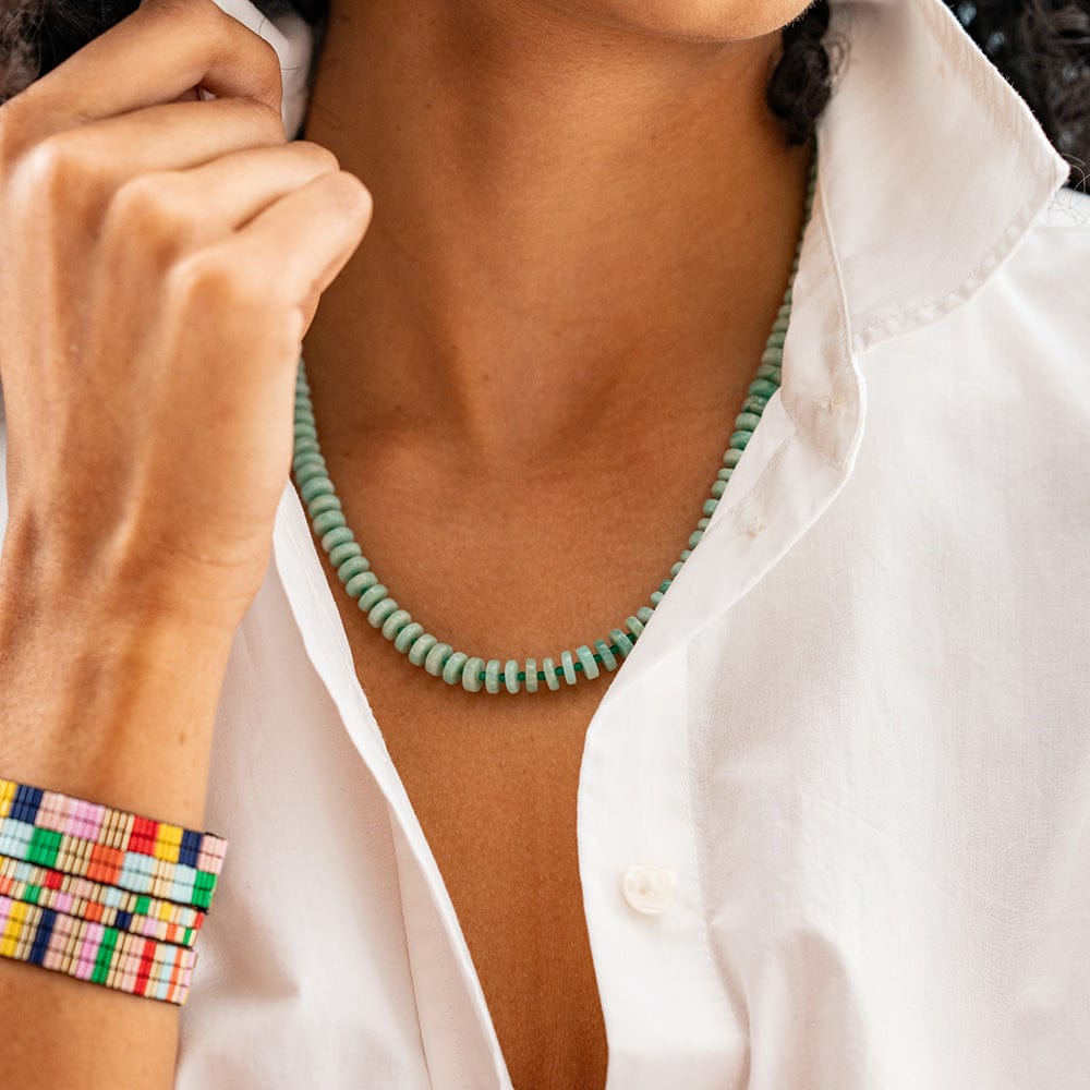 Elevate your look with the playful yet sophisticated charm of our Vivianne Amazonite and Green Onyx Necklace. Whether you're dressing up for a night on the town or adding an eye-catching detail to your everyday ensemble, this necklace is the perfect accompaniment.