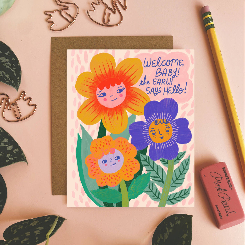 These illustrated smiling flowers are the sweetest way to welcome a new baby! All cards are printed by Dream Folk in a home studio in South Dakota.