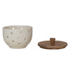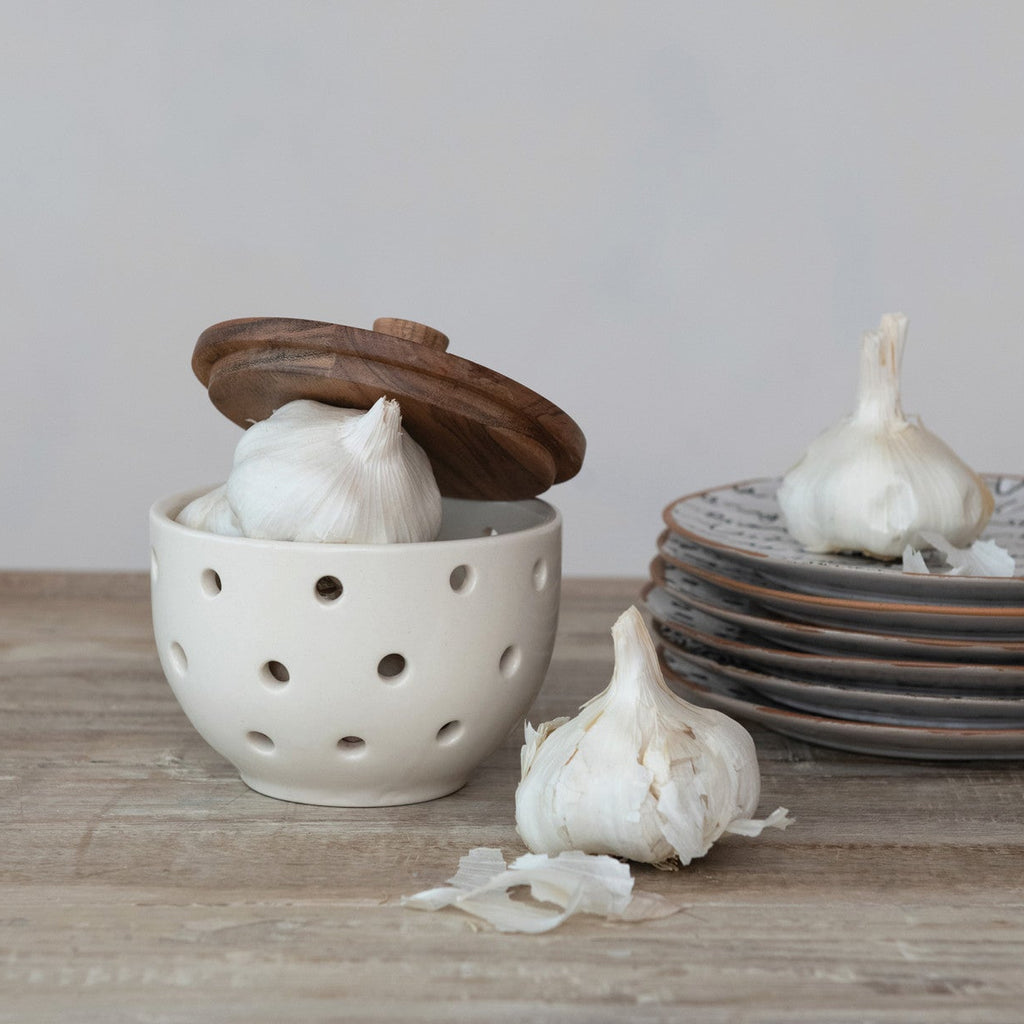 This stoneware garlic and onion keeper features a mango wood lid that adds natural warmth to your kitchen. The cream-colored base with ventilation keeps garlic and onions fresh while looking good on your counter.